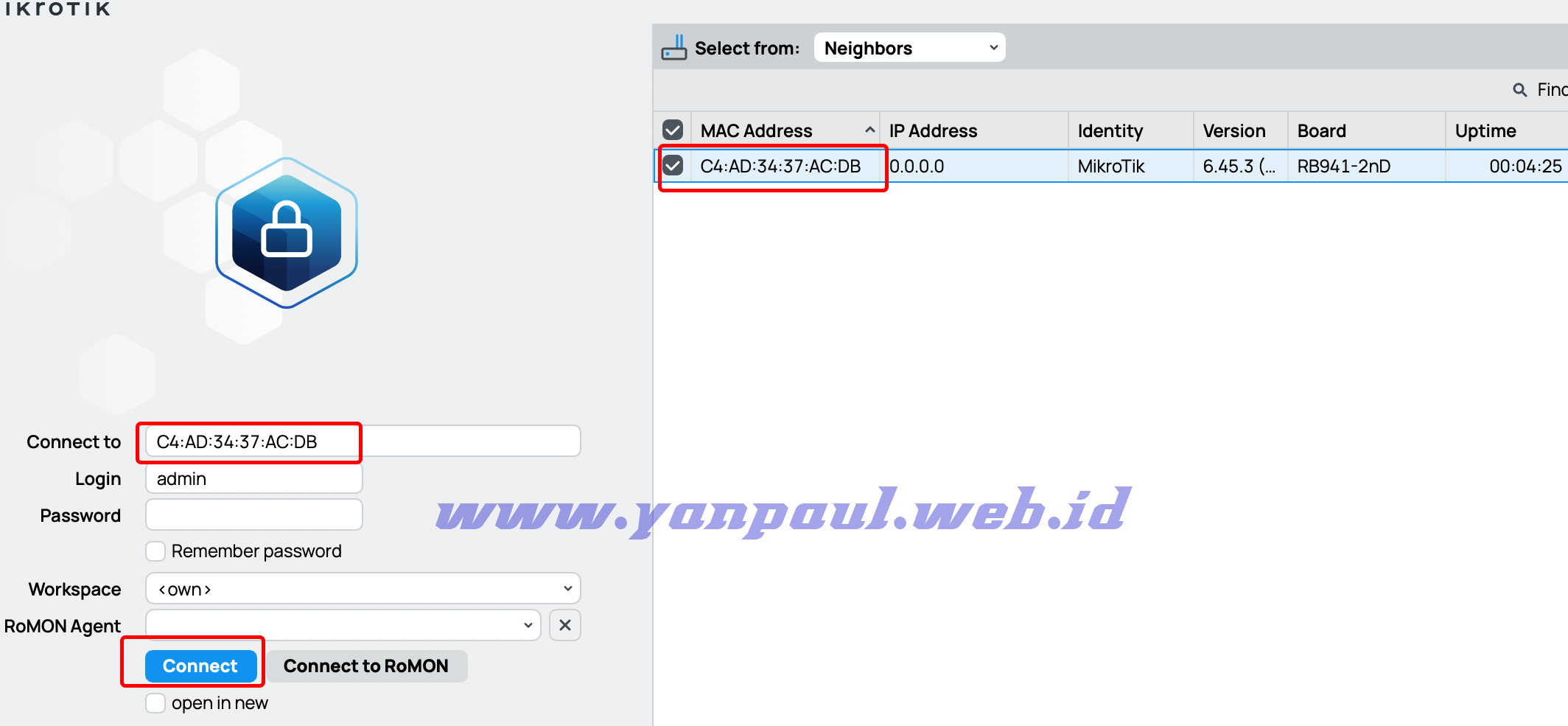 Saat router masih baru atau baru di-reset, hindari login menggunakan IP Address 0.0.0.0. Buka aplikasi Winbox, perhatikan bagian bawah dan klik tab Neighbors. Tunggu sampai perangkat MikroTik kalian muncul, lalu klik pada bagian MAC Address.