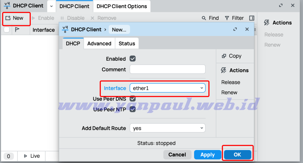 • Pada bagian Interface, pilih ether1 (karena kabel dari modem terhubung ke sini).