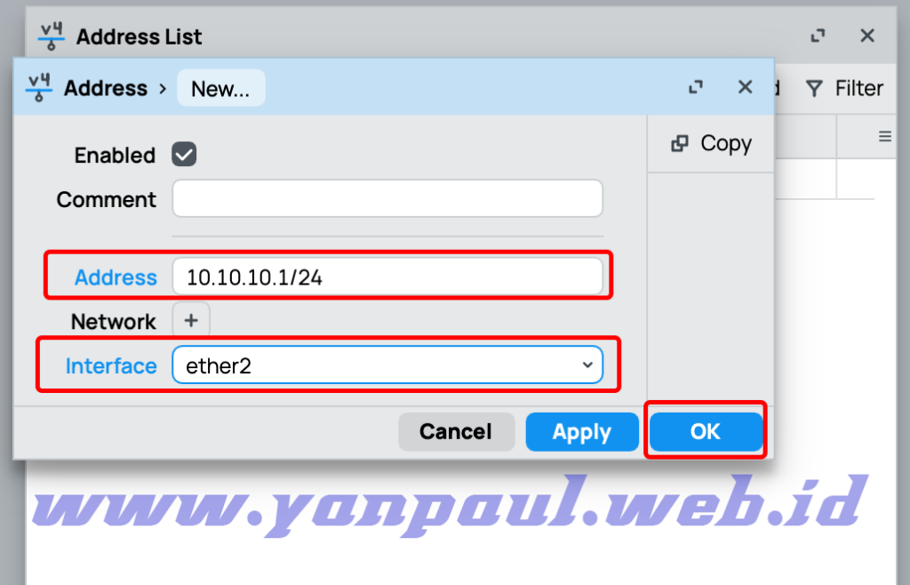 • Masukkan IP lokal bebas, contohnya: 10.10.10.1/24.