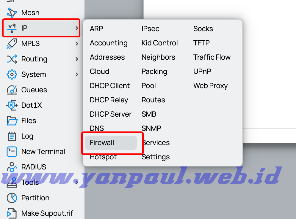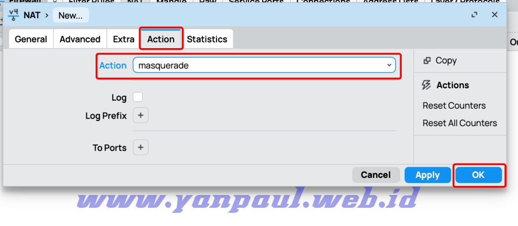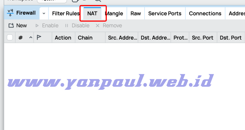 • Masuk ke menu IP > Firewall, lalu pilih tab NAT.