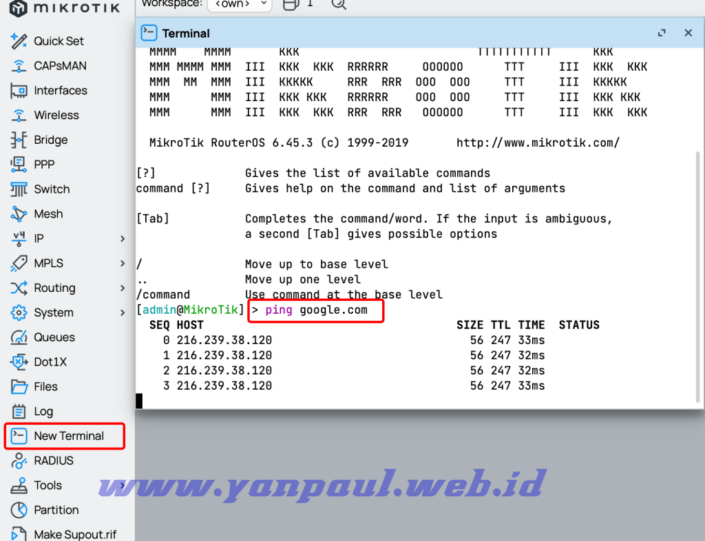 Untuk memastikan router sudah terhubung ke internet global, buka menu New Terminal di Winbox. Ketikkan perintah: ping google.com atau ping 8.8.8.8 (kemudian tekan Enter).