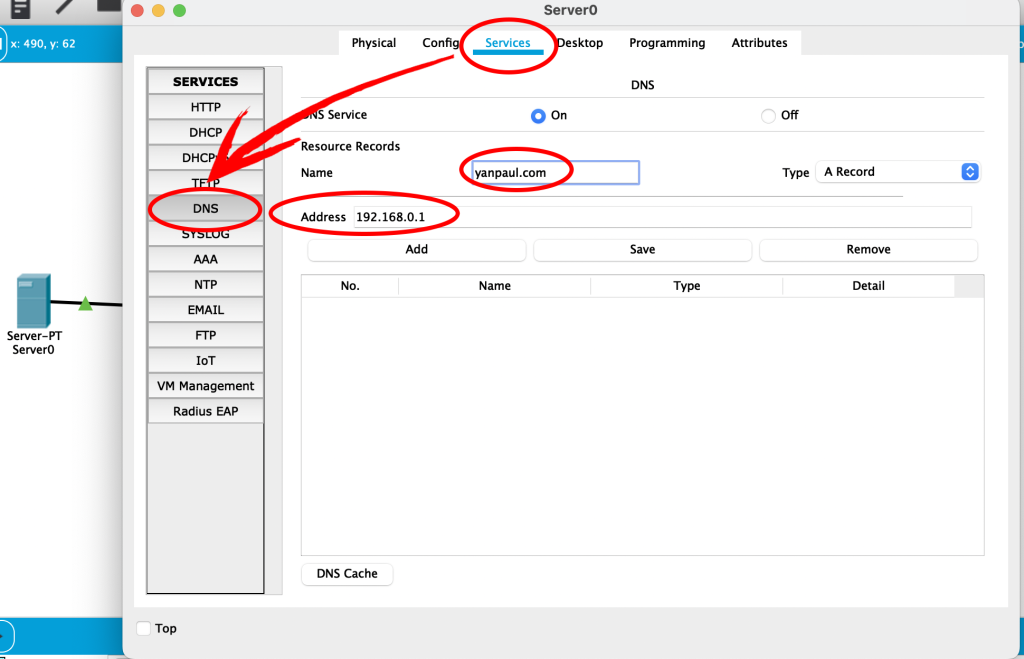 Langkah-langkah mengkonfigurasi DNS Server pada Cisco Packet Tracer (CPT) sebagai berikut: