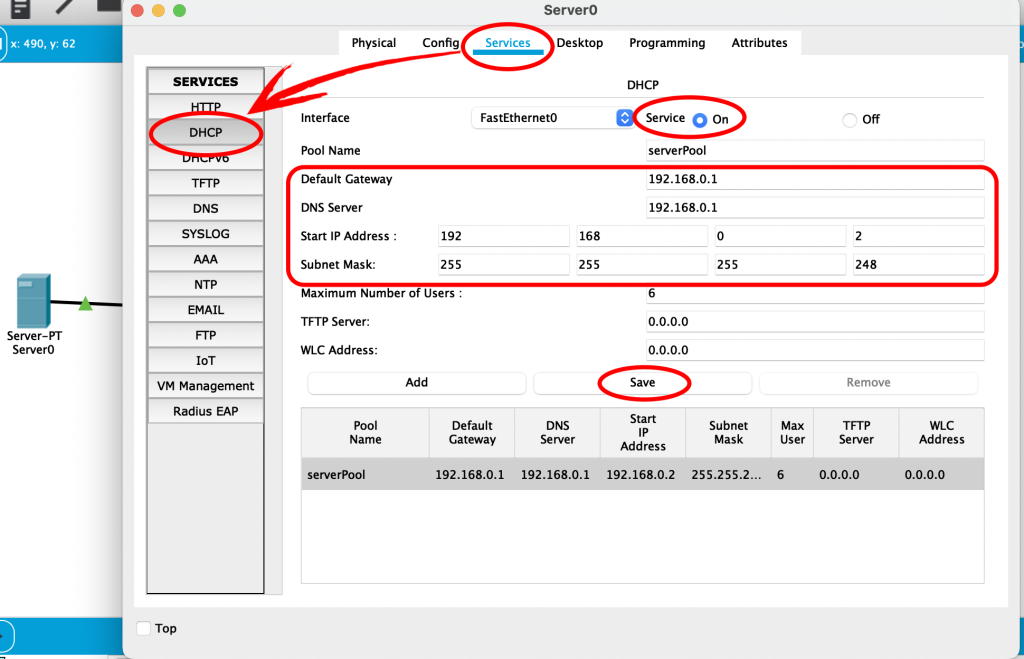 Selanjutnya plih menu Services, klik DHCP (seperti materi sebelumnya) dan konfigurasi sesuai gambar.