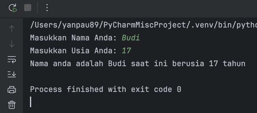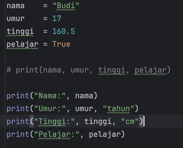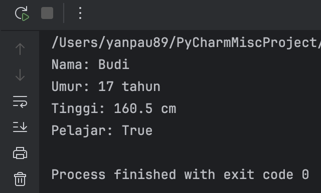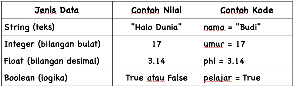 namamenyimpan teks"Budi"umurmenyimpan angka bulat17tinggimenyimpan angka desimal160.5pelajarmenyimpan nilai logikaTrue