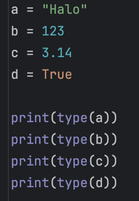 Untuk mengetahui tipe data dari suatu variabel, gunakan fungsi bawaan type().